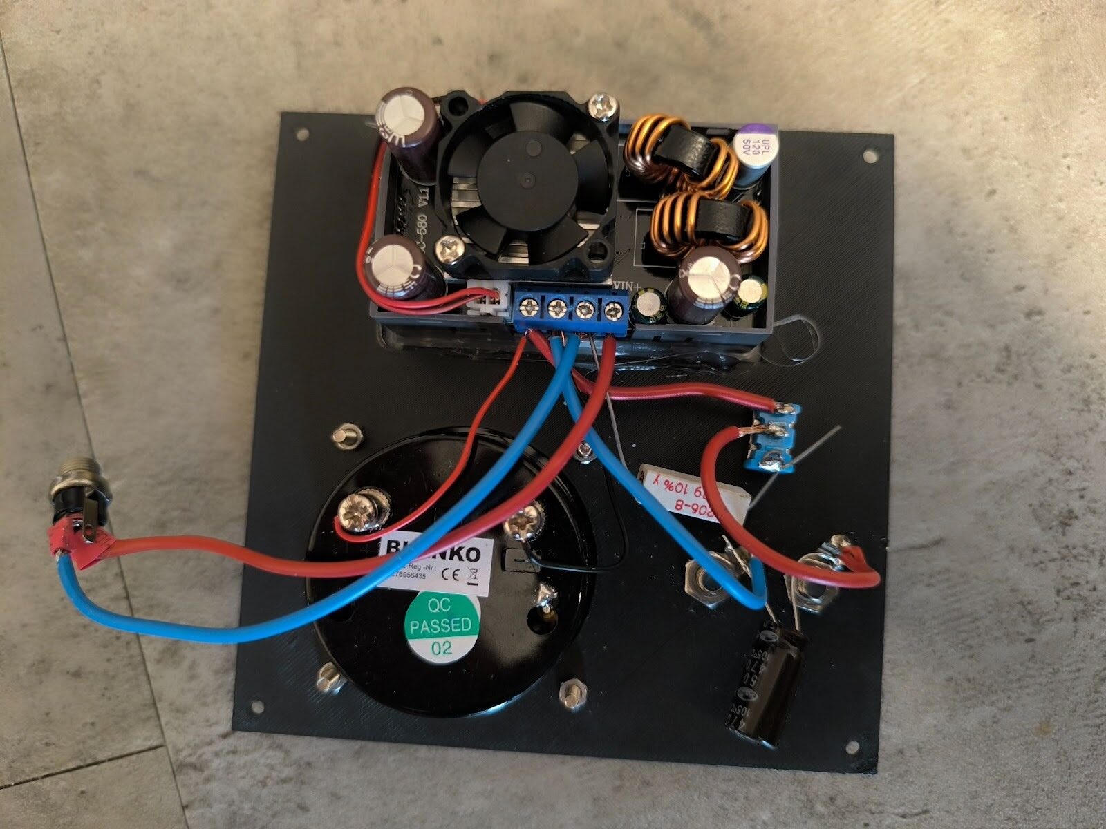 The module itself is quite compact, but also relatively heavy owing to the large capacitors and inductors as well as a well-sized heatsink with a fan. Nominally supporting up to 80W, it’s quite a beefy power supply. To work with it, I bought a laptop charger, because I very rarely use voltages above 19V (which most laptop chargers output), and the power output of a laptop charger is well-suited for the module, while laptop chargers themselves are very affordable. When I was at home in North Macedonia, I had a pretty janky setup with a generic plastic project box and the power supply system that generally worked. However, there were two main issues with this setup: